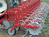 Культиватор оснащен двумя рядами лап с крыловидными лемехами, батареей сферических вырезных дисков на рессорной подвеске, а также опорным прикатывающим катком или двумя рядами фигурных дисков.